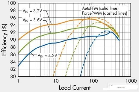 图5:FAN5362 效率与负载电流的关系,AutoPFM为实线 , ForcePWM为虚线。