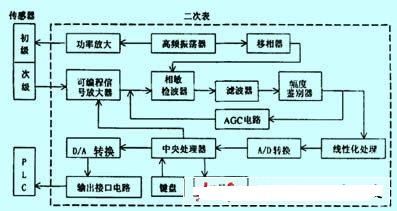 系统主要由传感器和二次表组成。二次表主要由高频振荡器、可编程信号放大器、相敏检波器、滤波器、幅度鉴别器、agc电路、线性化处理等电路构成。本文就系统关键部分电路的原理及作用加以论述。