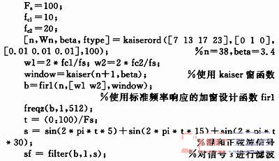 Matlab信号处理工具箱提供了各种窗函数、滤波器设计函数和滤波器实现函数。设计中利用Matlab提供的函数firl来实现,编程则是直接调用这些函数简单直观的完成设计。调用格式:firl(n,Wn,‘ftype’,Window),其中n为阶数、Wn为截止频率、ftype是滤波器的类型、Window是窗函数。应用凯塞窗的代码如下: