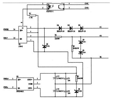 逆变器驱动电路采用日本三菱公司为驱动IGBT设计的专用集成电路M5 7962L,加少量外围元件构成。N87C196MC输出SPWM信号通过外围电路放大后直接给驱动???,驱动??橹苯忧疘GBT管,最大可驱动400AIGBT。当M57962L检测到IGBT管上C、E极电压高与8V,而且此时IGBT管开通时,持续时间大于2.5 μ s,则发出故障信号,同时封锁驱动波形,并且发出故障信号给N87C196MC,单片机产生EXTINT中断,封锁各路SPWM信号,高速关断IGBT。