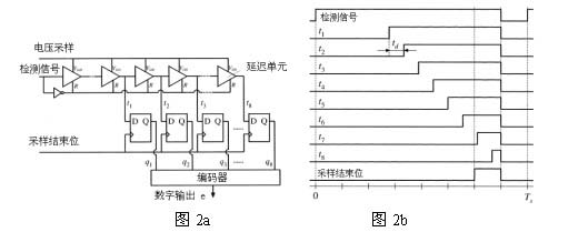 [page]控制处理器由高速A/D转换器,数字PID补偿器和数字DPWM输出组成。外部存储器记录了控制处理器的相关程序。高速A/D转换器是基于CMOS的传输延迟时间td 影响输入电压VDD的原理做成的,VDD电压和传输时间是成近似的反比例关系,即VDD越大,信号传输延迟时间越小。如图2所示,以CMOS的输入电压VDD作位采样电压的输入口,各信号之间的传输时间延时td受采样电压VDD影响。第四分之三个采样周期过后采样结束位产生高电平,开始记录q1到q8的输出,把得到的结果送入编码器得到数字输出e,完成A/D转换。如图2b所示,数字采样值为11111100.VDD越大,td越小得到的采样值越大。