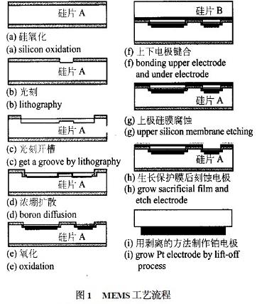 硅电容式压力传感器的敏感元件是半导体薄膜,它可以由单晶硅、多晶硅等利用半导体工艺制作而成。典型的电容式传感器由上下电极、绝缘体和衬底构成。当薄膜受压力作用时,薄膜会发生一定的变形,因此,上下电极之间的距离发生一定的变化,从而使电容发生变化。但电容式压力传感器的电容与上下电极之间的距离的关系是非线性关系,因此,要用具有补偿功能的测量电路对输出电容进行非线性补偿。由于高温压力传感器工作在高温环境下,补偿电路会受到环境温度的影响,从而产生较大的误差?;谀P褪侗鸬母呶卵沽Υ衅?,正是为了避免补偿电路在高温环境下工作产生较大误差而设计的,其设计方案是把传感器件与放大电路分离,通过模型识别来得到所测环境的压力。高温工作区温度可达350℃。传感器件由铂电阻和电容式压力传感器构成。其MEMS工艺如下: