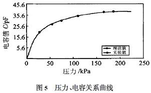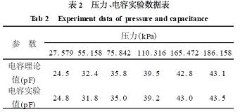 1可见,拟合的电容误差小于1%。由此可见,在不同的时刻测得UO(t),通过曲线拟合得出参数RC。再给电路加小信号直流电源,测出R值,即求得C,通过C值则可知被测环境的压力。图5为350℃时,不同的压力所对应的电容的理论值和实验值,从实验数据(表2)可得,在测压的过程中,利用模型识别的方法,误差较小,其测压误差小于2%。