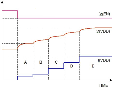 在A部分,通过限制流过分断开关的电流来减少负载电容充电时的浪涌电流;在B部分,升压转换器的开始电流限制在25%;在C部分,电流限制设在50%;在D部分电流限制为75%;在E部分,电流限制为100%。