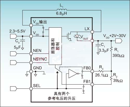 典型的反馈电压是1.15V±2%。当选择引脚(SEL)设置为低时,FB0反馈引脚就与参考电压进行比较,FB1引脚接地,用以提供反馈参考地。当SEL为高时,FB1用作参考电压,FB0接地。输出电压可用公式5和公式6计算: