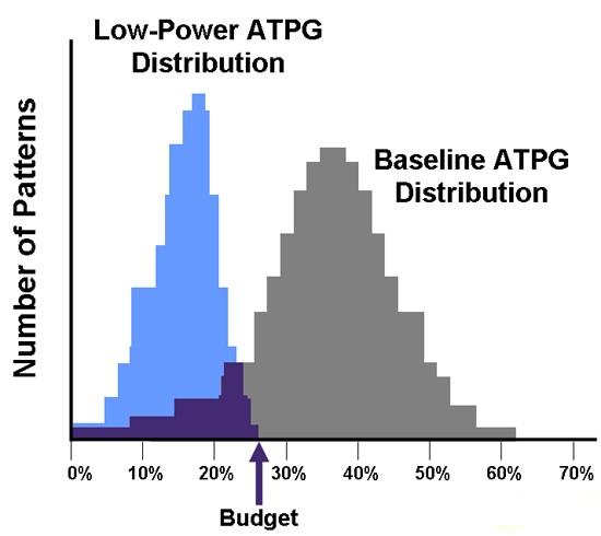 然而,如果我们采用相关技术降低测试期间的功耗,我们就能有效地将这种分布向左移。在图1中重叠的蓝色低功率分布区,扫描ATPG向量的峰值开关活动没有超过功率预算,因此降低了制造测试中功率问题产生的风险。