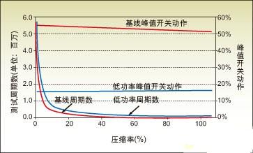图4:测试周期数和峰值开关动作与压缩率之间的关系。