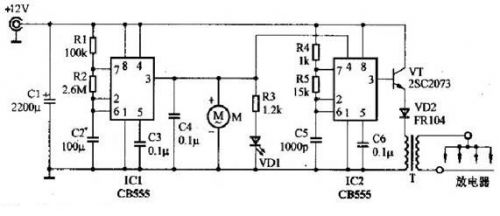 IC1、IC2选用两块时基电路CB555,或选用一块双时基电路CB556。注意,CMOS时基电路CB7555或CB7556因驱动电流较小,不适合本机使用。开关管VT选用2SC2073等中功率管。二极管VD2选用FR104等快恢复整流管。风扇M可选用12V、150mA左右的计算机CPU用的散热风扇,其体积较小、厚度薄、噪声很低,比较适合本制作使用,也可用12V玩具电机配以自制的风扇叶片代用。