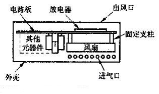 风扇M固定在电路板下方,风扇中心正对着放电器,相距15mm左右。风扇的出风方向应朝上,以便将放电器产生的负离子向上吹到空气中。整机应装入绝缘外壳中,在外壳上面正对放电器的位置开一些孔缝作为出风口,在外壳两侧靠近风扇的地方开孔作为进气口。12V电源线与汽车点烟器插头相连接。