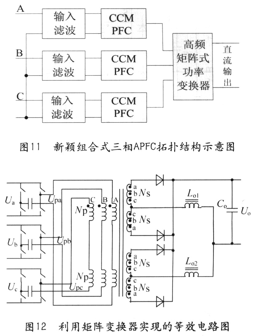 新颖组合式三相APFC拓扑结构示意图如图11所示,该电路由三个单相PFC电路组合而成,与前面所介绍的三相组合式PFC电路极其相似,不同点在于,该电路中三个单相PFC的输出并不是直接将三个单相直流输出电压并联,而是通过高频矩阵式功率变换器,使三个单相PFC直流输出耦合成一路直流输出。该电路的关键在于引入了矩阵变压器技术,充分利用了矩阵变压器磁耦合原理。其等效电路图如图12所示。