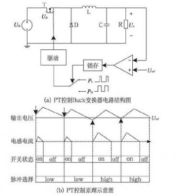 PT 控制技术通过在两级固定占空比的高、低能量脉冲中进行选择, 控制开关管的导通和关断,从而实现对变换器输出电压的调节。如果输出电压Uo 低于基准电压Uref , 控制器将连续产生高能量脉冲PH 直到输出电压达到基准电压值, 高能量脉冲的占空比为DH ; 如果输出电压Uo 高于基准电压Uref , 控制器将连续产生低能量脉冲PL 以降低输出电压, 低能量脉冲的占空比为DL ( DL< DH ) .由于高能量脉冲导通时间比低能量脉冲导通时间长,因此高能量脉冲作用的周期内将有更多的能量传递至负载端。图1( a) 和图1( b) 分别显示了PT 控制Buck 变换器结构图和PT 控制原理示意图。