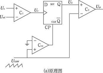 本节设计一种简单实用的脉冲序列控制器, 如图2 所示。图2 中时钟信号CP( Clock Pulse) 由峰峰值为- 10 V到+ 10 V 的锯齿波信号USAW 与电压信号UGN D ( UGND = 0) 通过比较器Ccp产生; 变换器输出电压Uo 与基准电压Uref 通过比较器C1 产生电压信号Ue;触发器D 在时钟来临时刻将电压信号Ue 传递至输出端Q, 并在下一时钟来临之前保持不变; 比较器C2 将D 触发器的输出信号和锯齿波进行比较产生控制脉冲PH 或PL 实现对变换器的控制。