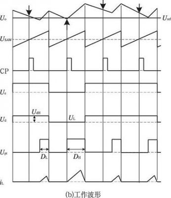 上述PT 控制器的工作过程为: 在开关周期的起始时刻, 时钟信号CP 来临, 若此时Uo > Uref , 则Ue 为高电平; 时钟信号同时使触发器D 触发, 触发器输出信号Ud 在下一时钟脉冲来临前保持高电平不变; 锯齿波信号USAW 与Ud 经过C2 比较, 输出占空比为DL的低能量脉冲信号P L.若Uo< Uref , 则Ue 为低电平;触发器输出信号Ud 在下一时钟脉冲来临前保持低电平不变; 锯齿波信号USAW 与Ud 比较产生占空比为DH的高能量脉冲信号PH .PT 控制器主要工作波形如图2( b) 所示。