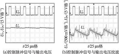 从图4( a) 中, 可以看出当MOSFET 管导通控制信号为高能量脉冲占空比为DH 时, 输出电压Uo 有小幅上升;而MOSFET 管导通控制信号为低能量脉冲占空比为DL 时, 输出电压Uo 有小幅下降, 与仿真波形图一致。在图4( b) 中,可观察输出电压Uo 的纹波图, 能够更清楚地反映开关管导通控制信号与输出电压的变化关系。从图中,可以更加明显看到开关管导通控制信号的变化对输出电压的影响, 与仿真结果基本一致。