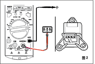 2.关闭点火开关,断开传感器的电子连接接头。黑色表笔插到仪器的“OUTPUT—”的插孔,另一端搭铁(使用鳄鱼夹),红色表笔插到“+OUTPUT”插孔,另一端与传感器的输入信号线连接(可以使用万用测试线),如图2所示。