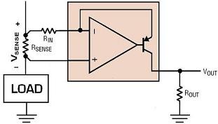 为了克服这些电流检测难题,人们创造了高端电流检测放大器。这些特殊放大器用来从高共模电压中抽取通过小检测电阻的电流产生的小差分电压。然后,检测电压被放大并被转换成以地为基准的信号。图 5 显示了高端电流检测放大器的基本拓扑。在这个图中,放大器给 RIN 加上等于 VSENSE 的电压。然后,通过 RIN 的电流流过 ROUT,提供以地为基准的输出电压。就这个基本功能而言,很明显,高端电流检测放大器应该有高输入阻抗、高增益和高增益准确度、以及宽共模范围和良好的共模抑制。也许不那么明显的是还有放大器精确度的重要性。