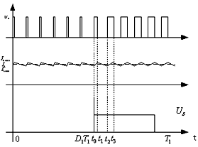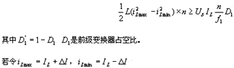 在t0时刻以前,S管开通,前级输出短路,理想情况下,变压器副边输出极窄的方波(Uo),当t0时刻S关断时,电流iL经S换流至二极管D,给负载输出电流。由于t0之前,前级变换器的占空比极小,突加负载后,由储能电感给负载提供部分电流,随着时间的延长,iL减小,受电流环的控制,前级变换器占空比增加,使iL回升至原值,故iL有一个波动过程。另外,如果电流环设计没有达到最优时,那么电流在调节过程中的超调量将很大,调节时间很长,致使加工电流不稳定,影响加工效率和精度。但从S的一个开关周期看来,由于f1》f2,S的一个周期中,前级变换器将要经历多个周期,即当S关断时,前级变换器有足够多的周期可以调节iL,使得iL稳定。假设iL的允许波动范围为ILmin~ILmax,并假设f1在S关断后经过n个周期,进入稳定状态,从能量的角度来看,即要保证在这n个周期中,当前级变换器无输出时,电感的储能要满足负载能量需求,这可用式(1)表示。