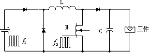 图1为前、后级变换器的主电路图。其中电容C的值很小,它的作用是高压引弧放电。具体工作过程是这样的:当开关S关断时,由于工件还处于开路状态,所以电感L中的大电流给C充电,致使工件两端电压线性急剧上升,直至高压击穿正常放电,此后,电流流经工件进行加工,一直延续到S开通时结束。假设前级变换器的开关频率为f1,后级电子负载开关S的开关频率为f2,那么f1和f2有以下4种情况。