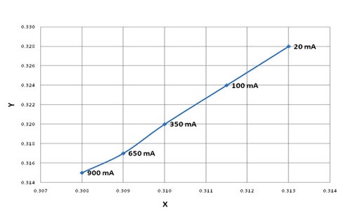 使用减小电流的方法进行LED调光类似于大多数白炽灯泡使用的调光方法。这种减小电流的方法在为数不多的应用中可以接受,但随着光等级降低,LED发出的光色彩也根据电流而变化。电流较小时,色度(Chromaticity)朝向黄色变化。图1显示不同电流时的典型色度变化。