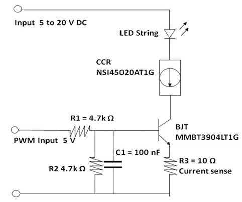 采用简单的CCR及双极结晶体管和PWM讯号控制的LED能够轻易地调光至汽车及建筑物照明应用要求的精度。使用双极结晶体管使LED能够以恒定电流驱动,从而不会有色度变化;光的色彩仍然保持一致,仅是LED发射的光量减小。