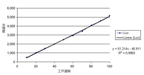 控制讯号的工作频率为300Hz,脉波宽度为30微秒(μs)。随着脉波宽度增加,LED导通的总时间也会延长,并提升光输出。在脉波接近零电平时,光输出也将接近零。图5显示不同工作周期条件下的流明输出曲线。