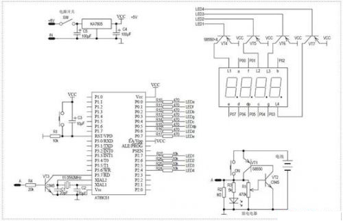 在实际电路中,L1就是第一只数码管的共阳极端。单片机的输出、输入接口数量都很有限,所以4位LED数码管驱动都是使用动态显示的方式。4只独立数码管LED的内部a、b、c、d、e、f、g、dp这8段发光管相对应的阴极都是并连的。统一由单片机P0口8位输出进行驱动。数码管要显示出数码还必须在共阳极端同时施加正电压才行。所以要让4位中某一数码管进行显示,只要在P0口输出字型码的同时,给这位数码管共阳极端加上正电压就行了,当然与此同时其他三位数码管的共阳极端要保持低电压,才不致显示出现混乱。数码管共阳极端驱动电流较大,所以采用了三极管进行控制。以第一只数码管为例,在P0端口输出字型码的同时,P37输出低电平,三极管T4导通,则共阳极端L1就得到高电平了,数字就会显示在第一只数码管上了。