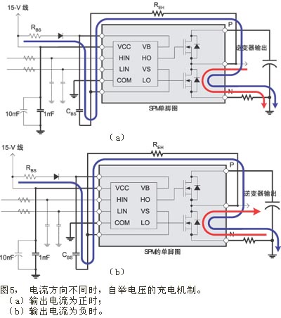 MOSFET逆变器的另一个优点是图4(e)所示的自举电压(阴极输出电压)。从图4(e)可以看出,电机的工作频率为10Hz。图中画出了自举电压和逆变器输出电流。当电流为正时,自举电压VBS维持在VCC=15V附近,但当电流为负时,VBS就下降到接近10V。这是由于不同电流方向采用不同的充电机制所造成 (参见图5)。当输出电流为正时,电流要么流经高压侧MOSFET,要么流经低压侧体二极管。在这种情况下,当低压侧体二极管导通时,将对自举电容CBS充电 (参见图5(a))。此时,对CBS的充电电压可由公式(2)表示。