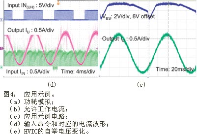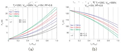 图4给出了本模块的一个应用示例。在图4(a)和(b) 的模拟中,假设结区温度Tj保持为125℃;该温度为本??榈淖畲蠊ぷ鹘崆露?。通过这项模拟,肯定当??橥饪俏露瓤刂圃?00℃并采用空间向量调制 (SVPWM) 时,输出功率可大于Pout=100W,并允许Pd=16W的功率损耗。根据这些信息,我们利用一台130W BLDC电机(正弦反电动势) 和图4(c)所示的电路,对??榈亩疃üβ式醒橹な笛?。实验中采用的散热片有效表面积约为100cm2。采用该散热片后,??樵?0kHz SVPWM下可向电机输出150W的功率;热功耗为12W。而此时??榈耐饪俏露任?6℃,MOSFET结区温度为104℃,环境温度27℃。在同样条件下采用图4(d)所示的非连续PWM时,由于有效开关频率降低,??榈墓目纱锏?W,而逆变器效率可达到95%。此时,??榈耐饪俏露任?2℃,结区温度为82℃(已考虑电机铁芯的损耗),逆变器的损耗为整个系统功耗的27%