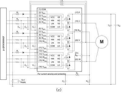 除了自举电路问题外,采用HVIC还会引起许多别的问题;尤其当VB电平低于地电平时最为显著。在HVIC中,高压侧栅极单元是用p-n结隔离的,而输入信号要通过额定电压为625V的电平漂移MOSFET传输到高压侧单元。为了降低信号传输期间的功耗,将开关信号转换成置位复位脉冲;该脉冲触发对应电平漂移MOSFET和高压侧单元中的置位复位(SR)闩锁电路。当VS低于 -5V时,电平漂移MOSFET不能传送触发信号到高压侧逻辑电路。而且,若VB小于0V,VB与逻辑地之间的寄生二极管将会导通;这会产生过量的电流,从而破坏HVIC。在实际应用中,当负载电流非常大,或有冲击电涌噪声施加在VB或VS端时,VB可能在很短时间内被拉到0V以下。除了对HVIC本身造成破坏外,还会使HVIC出现误操作或闩锁现象。当HVIC出现闩锁时,其行为将不可预测,而且,即使在恢复正常状态后,也可能被电源端之间的过量电流损坏。这类现象与HVIC的设计规则紧密相关,在设计阶段就应排除这种隐患。当HVIC产生误操作时,误操作导致的非正常关断可能中断正常的控制动作,但不大可能导致整个系统的破坏。然而,如果高压侧SR闩锁电路因电涌噪声而异???,高压侧功率MOSFET将处于非控导通状态,且不能在输入信号的脉冲负沿到来时复位。这种行为很可能在逆变器的某一管脚上造成短路,进而破坏功率???。为了防止这种现象,设计模块的HVIC时,我们针对可能出现的工作和环境条件,将出现误操作的可能性降到最低。同时,当过量的电涌或冲击噪声施加在器件上时,电平漂移单元和SR闩锁电路被设计成具有关断优先的特性。