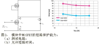 MOSFET的另一个优势是其耐用强度。它比IGBT的耐用强度高;与额定功率相同的其它器件相比,具有更宽的安全运行区 (SOA)。本文所介绍逆变模块中的MOSFET在典型的运行条件 (Vcc=15V, Vdc="300V", Tc="25"℃) 下,都能承受80ms的短路电流 (见图2)。而且,在出现电涌时,基于MOSFET逆变器的抵御能力优于额定电压相同的IGBT方案,这已被开关器件的雪崩额定电压值所证实。因此,在220V下可采用额定电压为500V的MOSFET,而在相同条件下采用IGBT,其额定电压则需要达到600V。但是,传统的MOSFET开关速度极高。MOSFET通常用于快速开关转换器,如AC/DC或DC/DC电源,这些应用场合要求栅极电荷Qg尽可能少,以降低开关损耗。不过,在电机驱动应用中,这种快速特性没有用处,尤其是高的dV/dt值还会引起电磁干扰。稳定性与最佳性能不易兼顾.