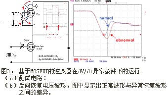 通常,增加栅极阻抗会降低MOSFET的开关速度。在如图3(a)所示的半桥电路中,如果高压侧MOSFET的栅极阻抗 (在HVIC中实现) 大,将会存在一定的短路电流;这个电流是上面那个MOSFET导通时的密勒电容Cgd感应产生的,不严重时一般不会察觉。但是,正如图3(b)所示,这种异常行为会增加逆变开关的损耗 (导通损耗),并最终减弱系统的额定功率和稳定性。在这样的瞬态过程中,要降低开关速度,同时又不失稳定性,上方那个MOSFET的Vgs应小于阈值电压Vth?;痪浠八担詈猛ü鹘贖VIC的关断阻抗来保证系统的稳定性,防止因电压变化而感应短路电流。但这会增加MOSFET的关断dV/dt值。