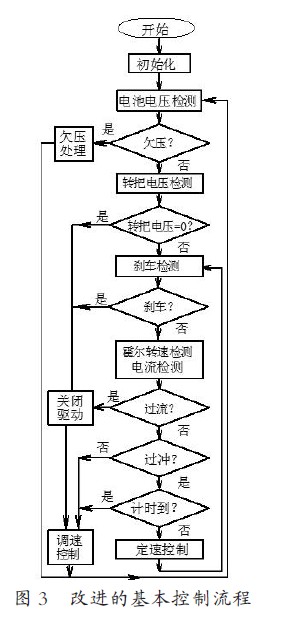 初始化之后,接着检测电池电压以判断是否低电压,如果低电压,将起动欠压?;?。如果电池电压正常,接着接收转把信号以判断操作者设定的速度大小,调整PWM 脉冲的宽度以调整电动机速度。电动机通电后,控制器接收电流检测信号、霍尔转速及相序信号、刹车信号等,判断电动机是否正常运转、电路是否正常工作,动态输出PWM 驱动控制信号,调整车速使之逐渐达到操作者设定的速度。在有异常时采取?;ご胧┲敝炼峡缭础?br />