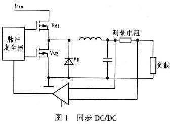 Vin为输入电压,VM1、VM2为MOSFET,VM1导通宽度决定输出电压大小,快恢复二极管和VM2共同续流电路,整流管的导通损耗占据最主要的部分,因此它的选择至关重要,试验中选用通态电阻很低的M0SFET。电感、电容组成滤波电路。测量电阻两端电压与给定值比较后,通过脉冲发生器产生相应的脉宽,保持负载电流稳定。VM1关断,快恢复二极管工作,快恢复二极管通态损耗大,VM2接着开通续流,减少系统损耗。