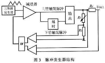 系统采用了电流负反馈电路,以适应激光二极管的要求。当负载变化,电流略大于给定电流时,减小ton宽度,电压降低。电流略小于给定电流时,增加ton宽度,这样可以维持电流稳定。图3所示为脉冲发生器结构。