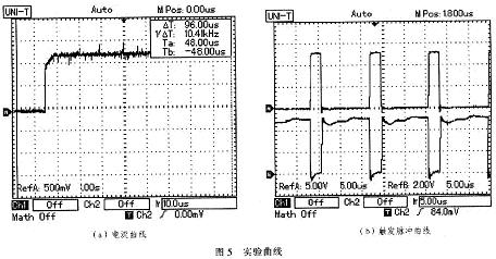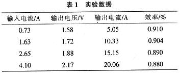 实验曲线如图5所示,实验数据为输入电压12 V,输出电压2 V左右,测量电阻0.0025 Ω,最大输出电流20 A。