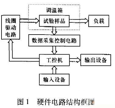 电磁继电器寿命加速试验装置包括试验控制柜、负载、自动调温箱(提供加速应力)3部分,其中控制柜由工控机、数据采集控制电路、线圈驱动电路组成,是设计的主要内容。硬件电路结构框图 如图1所示。