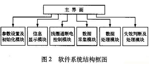 本系统应用软件由6个功能??樽槌桑翰问柚眉俺跏蓟??、信息显示模块、线圈通断电控制???、数据采集模块、数据处理???、失效判定及处理??椋浣峁箍蛲既缤?所示。