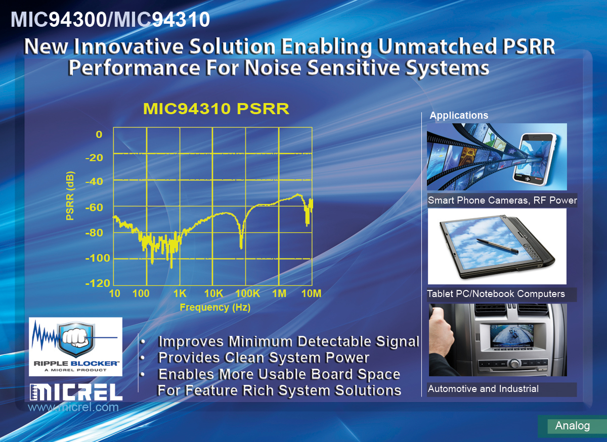 模拟、高带宽通信及以太网集成电路(IC)解决方案领域的行业领导者麦瑞半导体(Micrel Inc.)近日发布了Ripple Blocker系列IC,包括MIC94300电压跟随输出IC和MIC94310固定输出(LDO)IC。