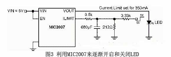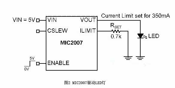 图2展示的是输出和LED相连的配电开关。MIC2007可以在2.5V-5.5V的输入电压下工作。它是通过外置电阻器Rset来设定限流值的。限流值等于CLF/Rset,CLF为限流因数,一般是245(请参考MIC2007数据表暨电气性能表),而Rset 则等于0.7 kΩ。因此,限流值就是245/0.7 kΩ = 350 mA。