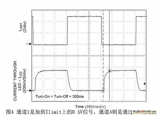图4中通道1是加到Ilimit上的0 5 V信号,而通道4则是通过LED的电流(Iled; 开启时间= 关闭时间= 300 ms)。
