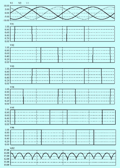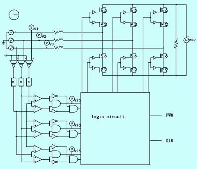 虚拟整流技术的实现,主要通过三相同步检测电路取得同步控制信号,然后控制功率器件来模拟二极管桥式整流电路对三相交流电进行整流,同时防止输入的三相交流电相间短路。其原理如图9所示,是一个输出方向固定的虚拟整流电路。仿真波形如图5所示,它们分别是矩阵变换单元的三相输入电压、6路同步信号和虚拟整流后得到的输出电压波形。
