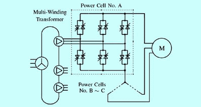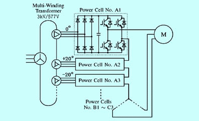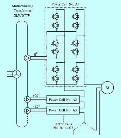 其实现方法是:三相高压交流电经移相变压器的降压、隔离和相移,形成互差一定角度的三相交流电。将该三相交流电分别送到各个矩阵变换单元,经虚拟整流、换向、PWM斩波控制和三电平转换,得到单相的交流电输出。将数台矩阵变换单元的输出端串联起来,并组合成星形,便得到了可直接驱动高压电动机的三相交流电。每台矩阵变换单元通过一对光纤接受控制器的指令和PWM信号,同时也能向控制器传送状态和告警信息。矩阵变换单元,采用虚拟整流技术,没有真正的直流环节,不需要平波电容器,所以使用寿命得到延长,可以减少维护量,甚至可以设计出免维护的产品。