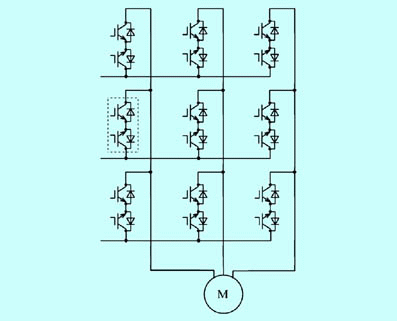 H桥级联型高压变频器,主要由移相式输入变压器和多个H桥单相逆变单元共同组成,单元与单元之间串联,并最终进行星形连接,从而实现三相输出。如图3所示,是一个3kV H桥级联型高压变频器的电路拓扑形式,它的每一个相电压由3个H桥单元串联而成。