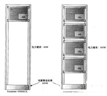 以图所示的服务器为例,两个服务器来自同一个系列WasteTech""sEscalenteline。左边的WasteTech""sEscalente5000SUX配置了足够的硬件,只需要60W的电能。右边的6000SUX的最高配置安装上足够多的硬件后则要消耗540W的电能。然而两台服务器却使用了同样的电源。尽管目前的电源使6000SUX获得了足够的电能,但是对于消耗电量较少的服务器而言,则提供了过多的电能。这种过度供电造成了浪费。