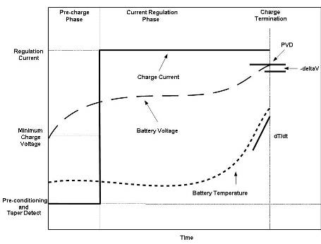 就镍基可充电电池而言,快速充电终止基于电压或温度。如图 1 所示,典型的电压终止方法是峰值电压探测,在峰值时即每个电池的电压在 0~-4mV 范围内,快速充电被终止。基于温度的快速充电终止方法是观察电池温度上升率 来探测完全充电。典型的 率为 1℃/每分钟。
