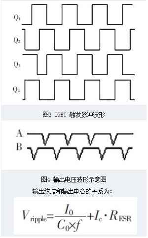 通过小功率试验的验证,证明了该方案的可行性,采用本方案可以在较低的工作频率下达到输出低纹波直流电压的目的,可以减小半导体开关元件的损耗,提高元器件使用寿命和设备的稳定性,同时对控制等辅助电路的要求也降低;另外并联后输出电压的脉动频率高且幅值小,容易滤波,所以可以减小输出端的滤波电容。由于电路是两路电源并联的结构,可以提高电源的输出容量。