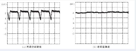 图6 中所标的电压值为乘以分压器变比以后的值。图6(a) 为没有经过并联的两路分别输出时的电压波形,可以看到,单路电压输出存在缺口,而且缺口处脉动较大,并有一定的毛刺。图中6(b)为两路并联后输出的电压波形(未经电容滤波),与图6(a)相比较,可以清楚地看到两路并联后,大的缺口在输出波形中消失,输出电压脉动明显减小,纹波变低,达到了实验目的,验证了设计思想的正确性。