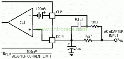 如图4所示,这个电路限制充电电流以防止系统功率升高时交流适配器过载。要设定输入电流限制,最重要的就是要最小化墙式配适器的额定电流。限流电阻可以通过下两式来计算。