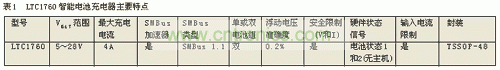 LTC1760是一个高度集成的三级电池充电器和选择器,用于使用双智能电池的产品。它是一个降压开关拓扑电池充电器,具有符合智能电池标准定义的多种功能和其他新增功能,如输入限流和安全限制,等等。三个SMBus接口使LTC1760能实现诸如跟踪两个电池的内部电压和电流之类的伺服功能,并允许一个SMBus主机监视任一电池的状态。这种伺服技术能使充电器的准确度同电池内部电压和电流测量值只有±0.2%的误差。
