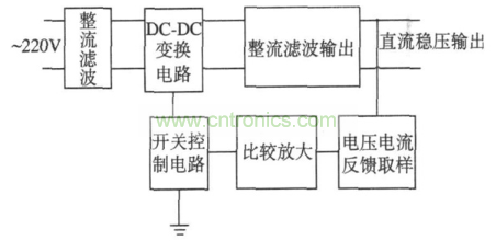 开关直流稳压电源是基于方波电压的平均值与其占空比成正比以及电感、电容电路的积分特性而形成的。其基本工作原理是,先对输入交流电压整流,从而形成脉动直流电压,经过DC-DC 变换电路变压,再通过斩波电路形成了不同脉冲宽度的高频交流电,然后对其整流滤波输出需要电压电流波形。如果输出电压波形偏离所需值,便有电流或电压采样电路进行取样反馈,经过与比较电路的电压值进行参数比较,把差值信号放大,从而控制开关电路的脉冲频率f 和占空比D,以此来控制输出端的导通状态。因此,输出端便可以得到所需的电压电流值。
